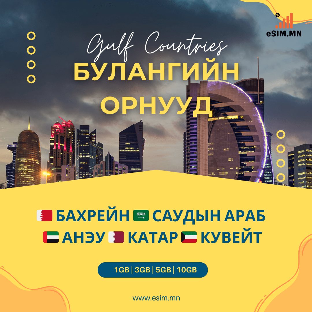 Булангийн Орнууд еСИМ (Bahrain, Saudi Arabia, UAE, Qatar, Kuwait Data eSIM)